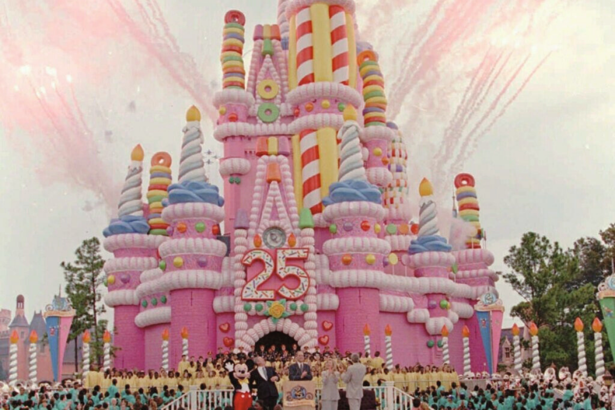 For Walt Disney World’s silver anniversary, Imagineers went all out, wrapping the entire 189-foot castle to resemble an 18-story pink birthday cake — complete with frosting swirls, giant candy canes, and candles. The look lasted until 1998.