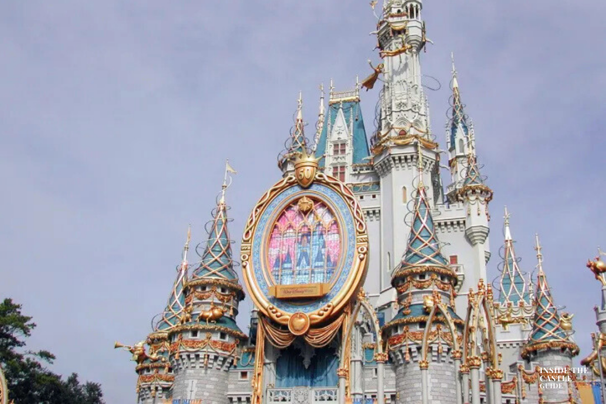 As part of a global birthday celebration, the castle gained gilded accents, gold statues of classic Disney characters, and a magical mirror that rotated through the opening dates of Disney parks around the world.