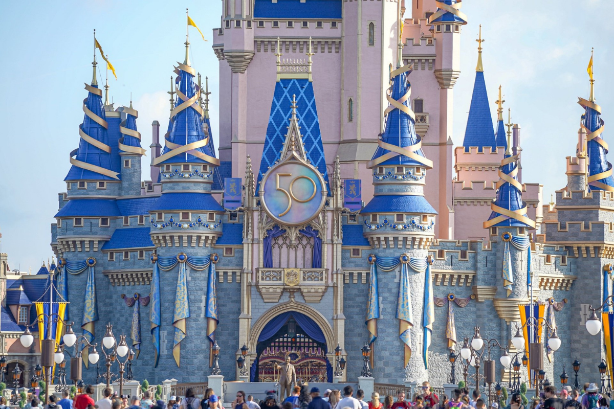 For its own golden anniversary, the castle was adorned with shimmering ribbons, jewel-like draping, and a giant “50” crest above the clock. Imagineers called it “a celebration of light and reflection,” and it sparkled nightly in the “Beacons of Magic” show.