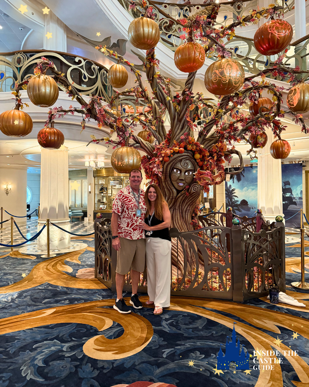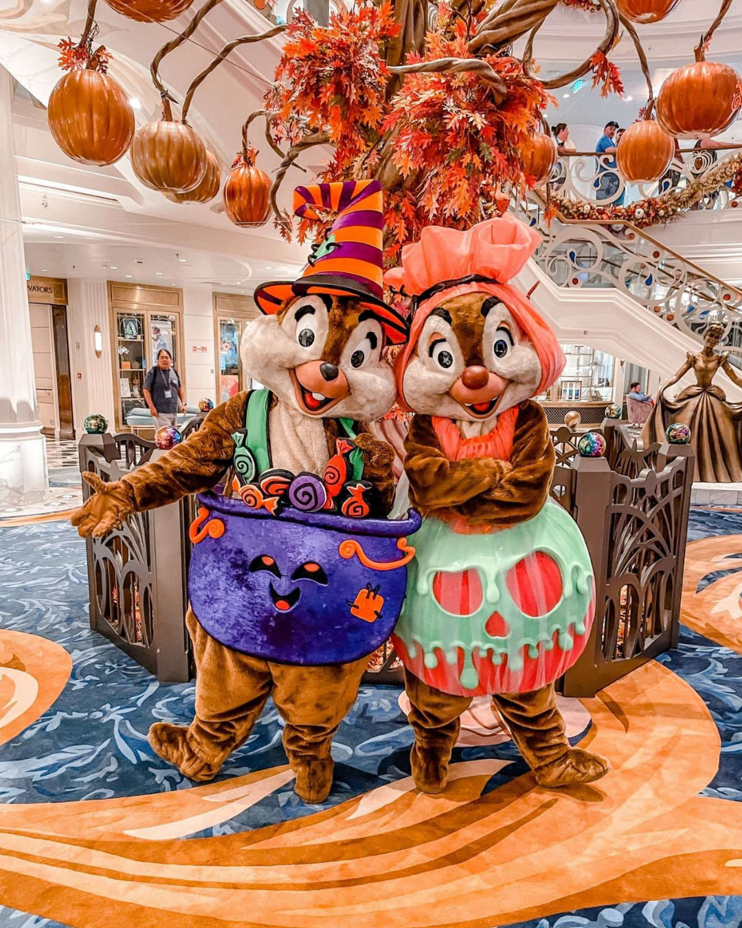 From the moment you step onboard, the ship feels like a floating haunted house — but in the most magical, Disney way possible. The atrium is filled with autumn garlands, glowing pumpkins, and the star of the show: the Pumpkin Tree.